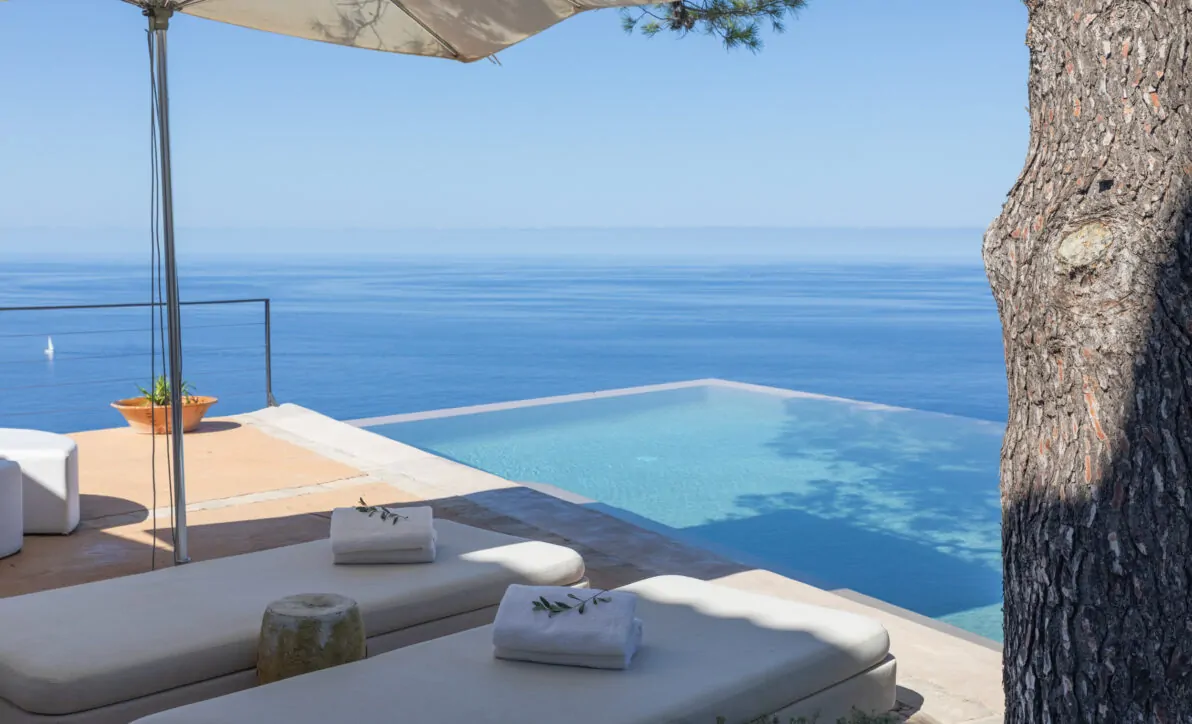 La gran piscina de borde infinito ofrece vistas maravillosas del mar abierto y de la costa, llegando hasta Cala Deià.
