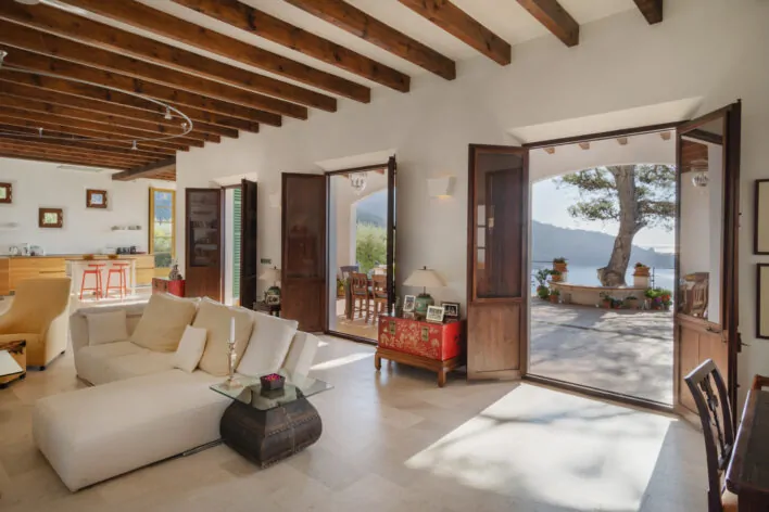 Debido a su ubicación elevada en un acantilado, la casa ofrece una vista panorámica de 360 grados de las montañas y el mar, siendo una de las pocas casas en Mallorca que tiene la puesta de sol sobre el mar los 365 días del año.